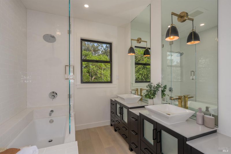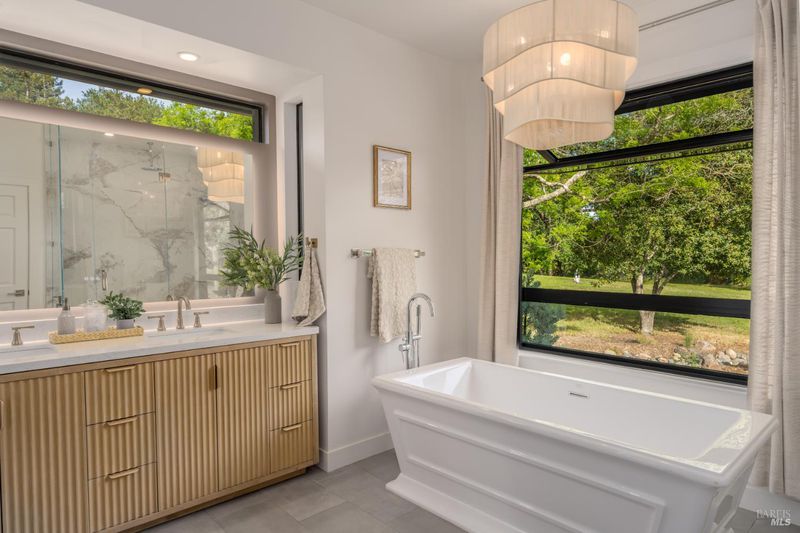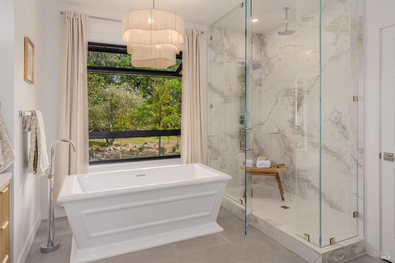 - Double Sinks, Marble, Quartz, Radiant Heat, Shower Stall(s), Soaking Tub, Window
