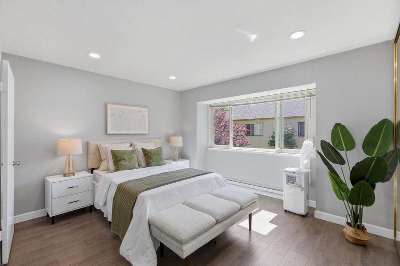 Affordable End Unit 2-Story Townhouse located in the heart of Silicon Valley. No neighbors upstairs and downstairs; two assigned carports and abundant parking space for visitors. Newly updated with fresh paint and modern recessed lighting. Downstairs, open floor plan between kitchen and the spacious living room, with a large sliding glass door leading to a private yard, offering an outdoor space for relaxing and gardening. Upstairs, enjoy two general-size bedrooms with large closets. This community offers pools, spa, saunas, club rooms, evening security & children's play area, etc. HOA covers water and garbage and enjoy the benefit of Santa Claras low-cost utilities. Walking distance to Central Park, Santa Clara Public Library; Close to Nvidia, Apple, and many high-tech companies. Great starter home for both first-time buyers and savvy investors. Don't miss out on this move-in-ready townhouse in a prime location!