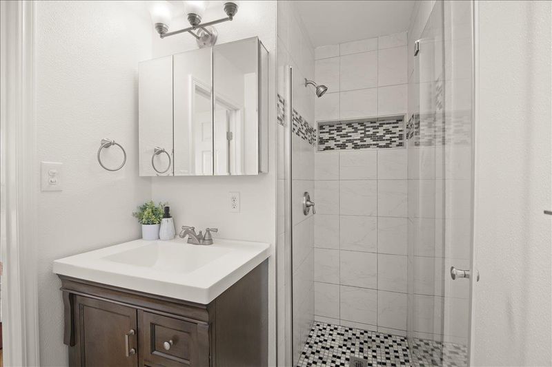 Primary - Stall Shower(s), Shower over Tub - 1, Stone, Tile, Tub, Updated Bath