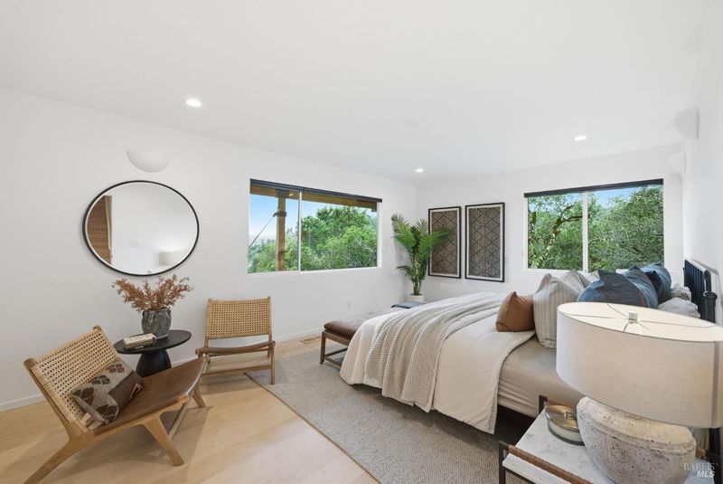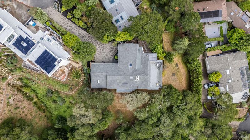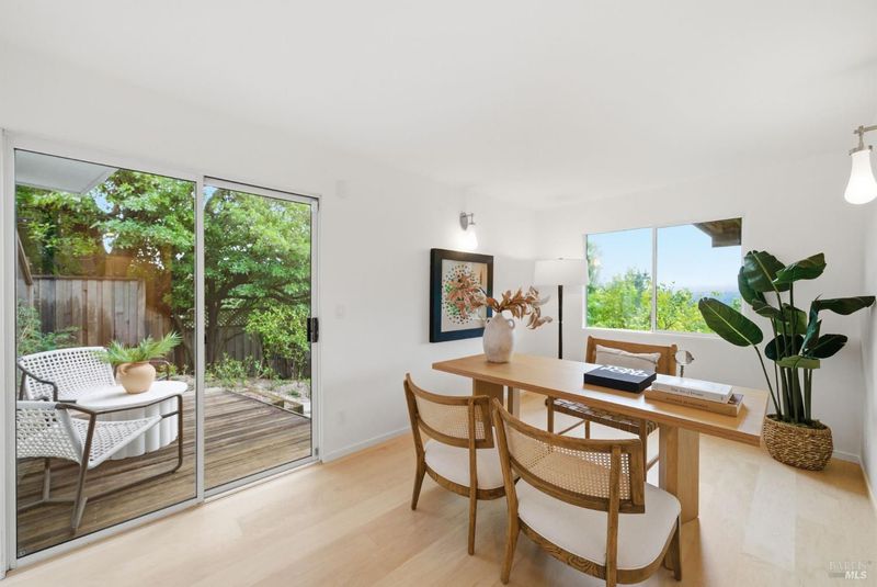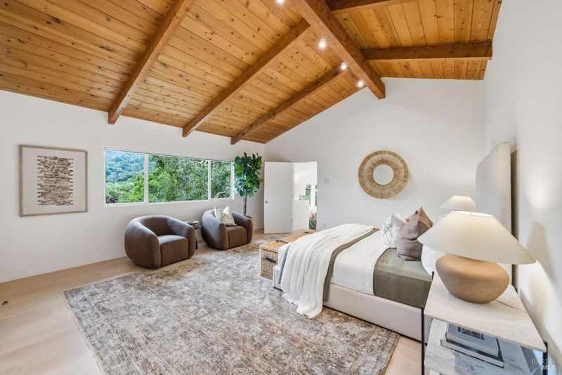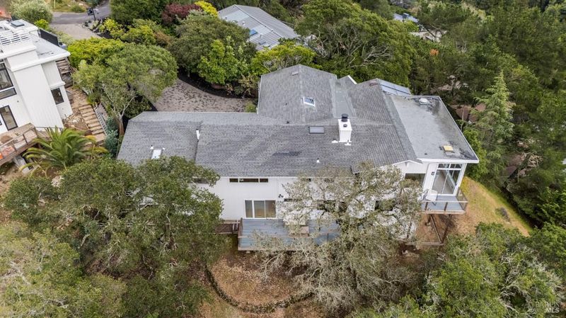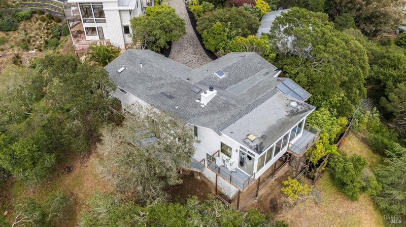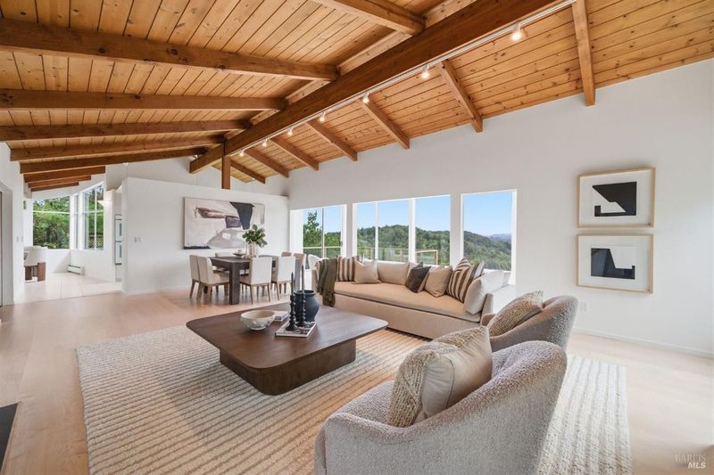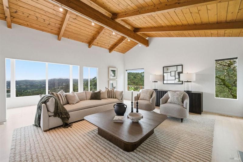 Tucked into the coveted Country Club enclave of Mill Valley, where hawks glide overhead, and world-class trails begin just beyond your doorstep, this beautifully refreshed residence offers a rare combination of privacy, scale, and breathtaking views. Sited on an exceptional ~-1/2acre lot, the home enjoys sweeping vistas that stretch from the San Francisco skyline to the ridgelines of Mt. Tam, with natural beauty and light pouring in from nearly every room. Recently refreshed and meticulously maintained, the home presents as turnkey, blending its original architectural character with a clean, modern sensibility. The expansive five-bedroom, three-and-a-half-bath floor plan is both versatile and inviting. Vaulted, beam ceilings and generously scaled living spaces create a sense of volume and ease, while a stunning sunroom with floor-to-ceiling windows frames the surrounding landscape like a living work of art. Designed for both everyday living and flexibility, the home includes a spacious family room with extra storage or potential wine room, a large primary suite with an adjoining flex space, and a thoughtfully designed bedroom wing with a separate entrance ideal for guests, extended family, or potential ADU use (buyer to verify). Outdoor living is equally compelling, with multiple decks positioned to capture the views and serene setting. The grounds are beautifully landscaped with mature roses, fruit trees, and layered plantings, creating a peaceful, garden-like retreat. Additional features include a private driveway with play area, covered parking, abundant storage, and a quiet, tucked-away setting that feels worlds away yet remains just minutes from the Mill Valley Golf Course, downtown amenities, and everyday conveniences. Homes of this caliber, on lots of this quality, rarely come to market, especially after being held for over four decades. A truly special opportunity in one of Mill Valley's most desirable neighborhoods.