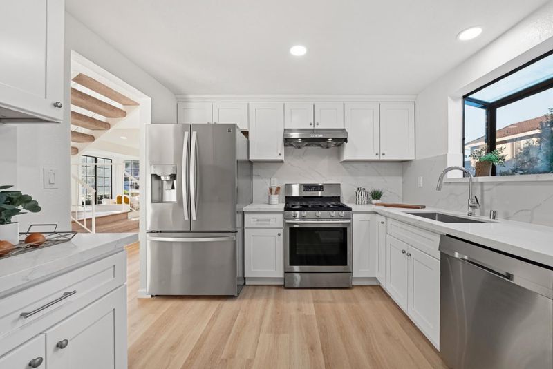 - Countertop - Quartz, Dishwasher, Garbage Disposal, Hood Over Range, Oven Range, Refrigerator